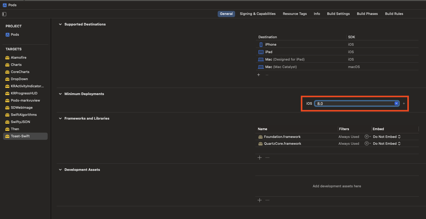 Targets에 있는 모든 Minimum Deployments를 빨간색 네모친 부분을 11.0으로 변경하니 시뮬레이터에서 정상적으로 빌드가 되는 것을 확인했다.