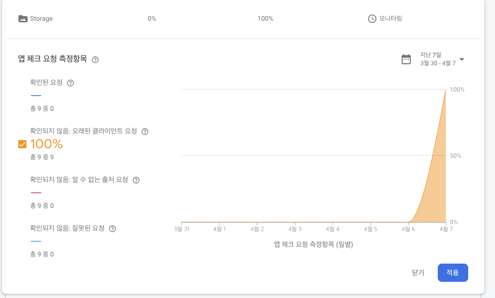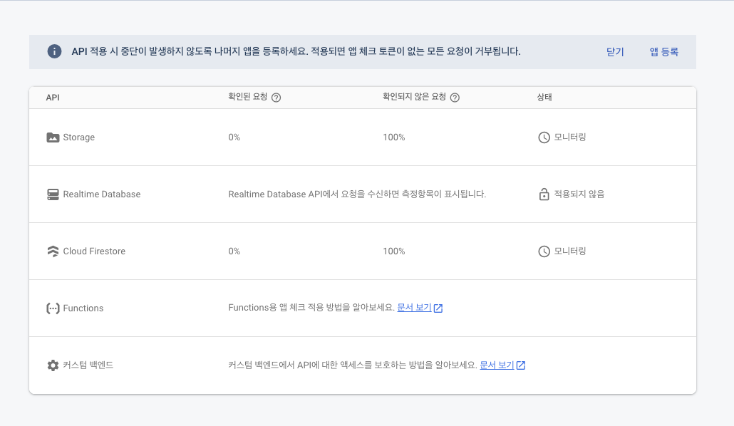 7. firebase 프로젝트에서 AppCheck 메뉴에 들어가서 각각 API를 클릭하여 적용을 클릭하여 AppCheck를 활성화 후 확인한다.