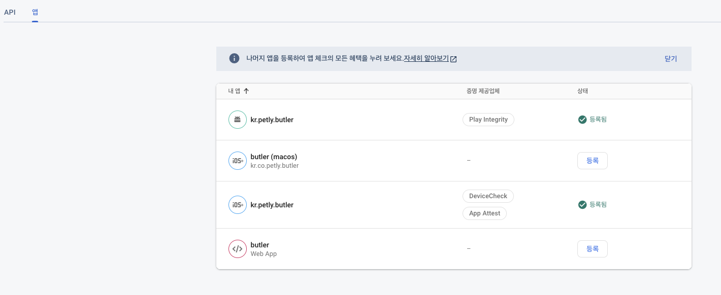 그리고 firebase에서 appcheck 화면에 들어가서 등록 버튼을 눌러 각각 디바이스 appcheck를 등록해준다.