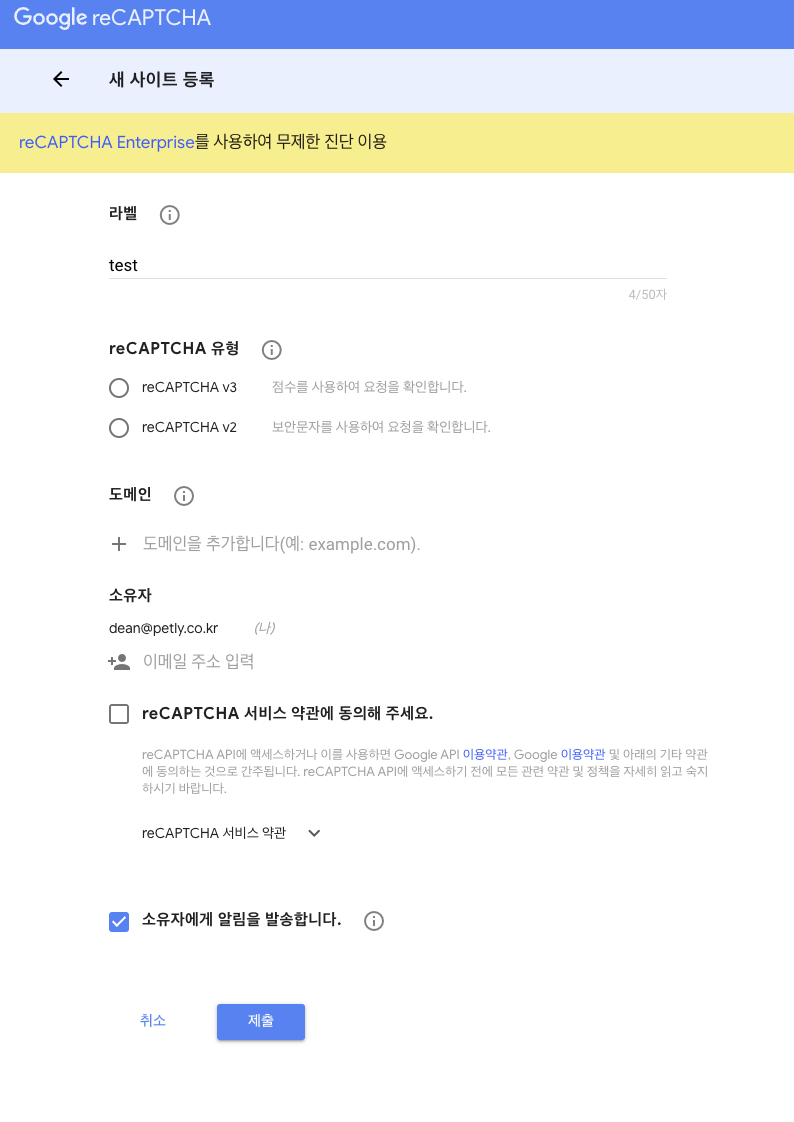 https://www.google.com/u/1/recaptcha/admin/create?hl=ko 로 이동하여