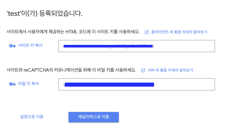 그러면 이렇게 키가 생성되는데 사이트 키를 복사후 recaptcha-v3-site-key 부분을 복사한 키 값을 붙여넣으면 된다.