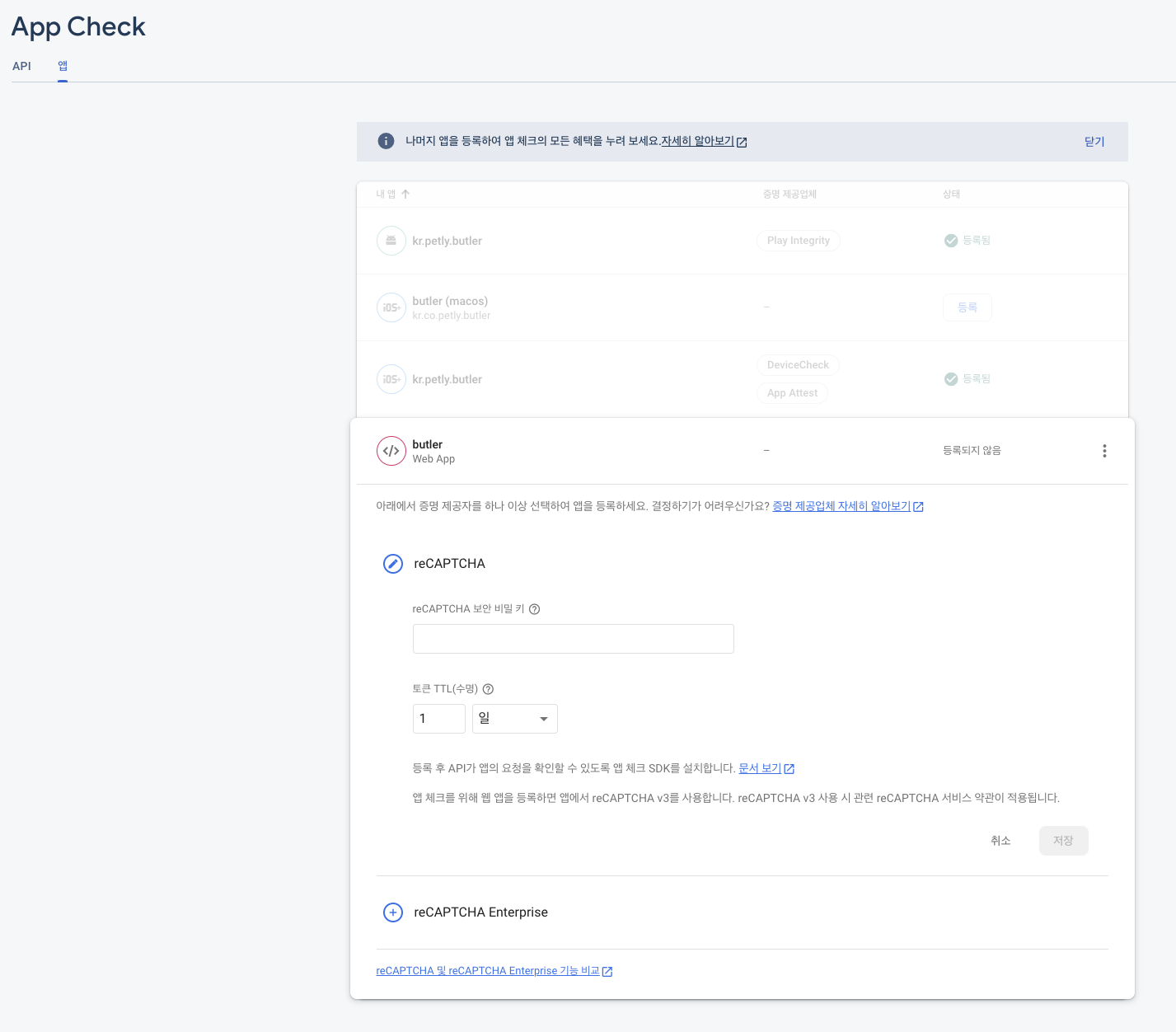 그리고 firebase appCheck에 가서 Web App에 key값을 동일하게 붙여넣고 저장한다.