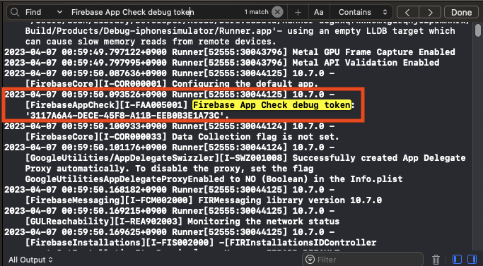 이렇게 추가 후 시뮬레이터에서 빌드 후 Firebase App Check debug token를 검색하면 이렇게 시뮬레이터 토큰이 생성된다.