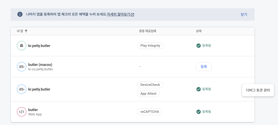 이 토큰 복사하여 이제 Firebase 홈페이지로 들어가서 프로젝트로 들어가 App Check를 클릭한 뒤 상단 메뉴중 앱을 클릭한다.