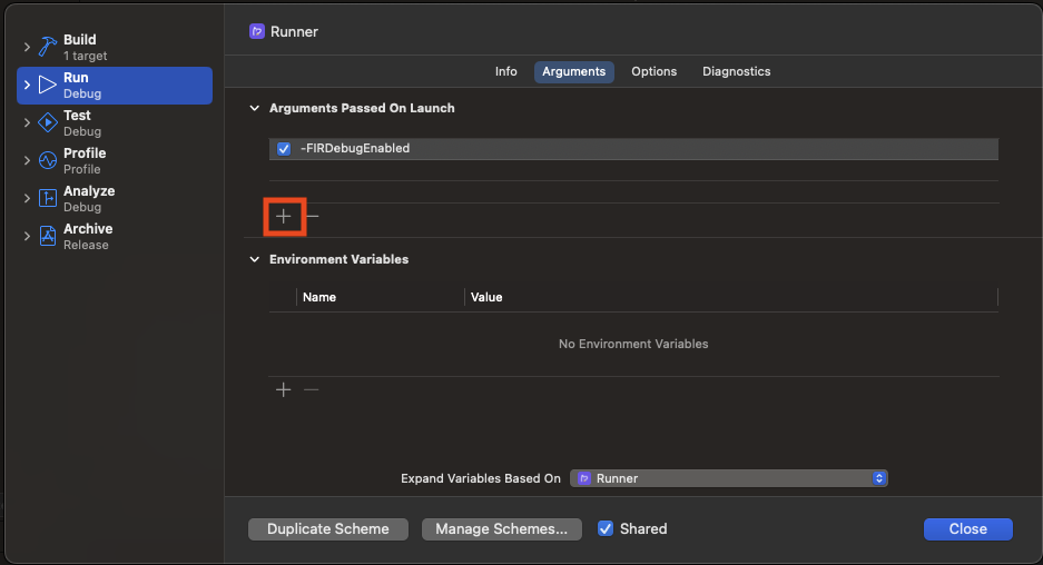 5. 그다음 Arguments Passed On Launch 하단에 +를 누르고