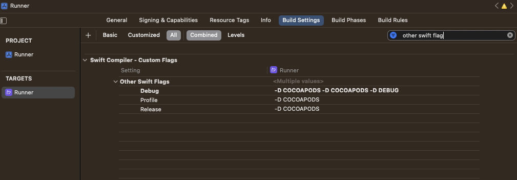 info.plist 파일을 열어 Bulid Settings에서 other swift flag를 검색후