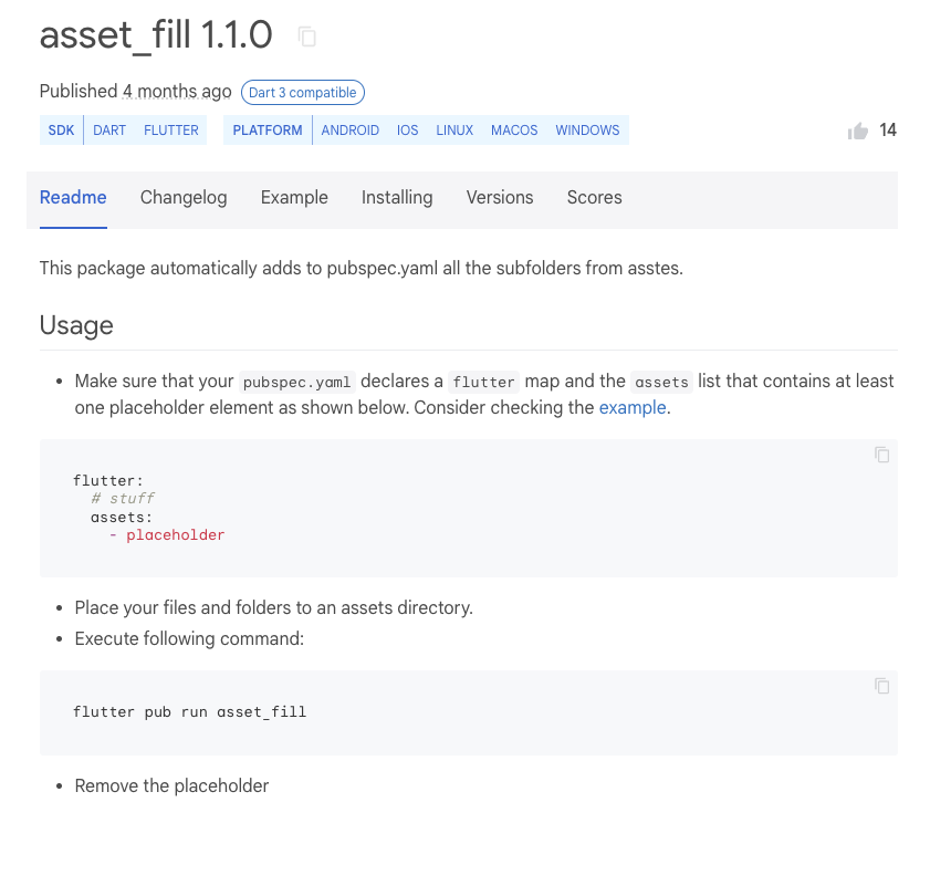 1. 터미널에서 flutter pub add asset_fill 를 프로젝트 폴더에서 실행하여 asset_fill을 추가한다.