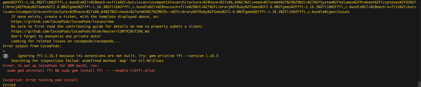 Error: To set up CocoaPods for ARM macOS, run: sudo gem uninstall ffi && sudo gem install ffi -- --enable-libffi-alloc