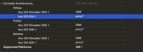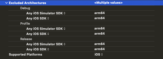 arm64라고 붙어있는거 보니 xcode에서 bulid setting을 바꿔주면 되겠구나 싶어서 바꿔보았다.