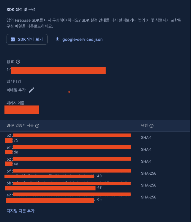 첫번째로 확인한건 Firebase에 있는 Android 앱의 SHA 인증서 지문이 틀린지부터 확인해보았다.