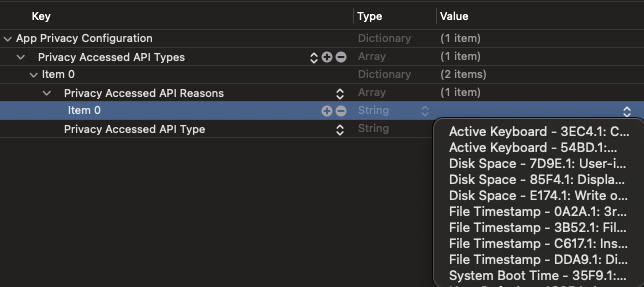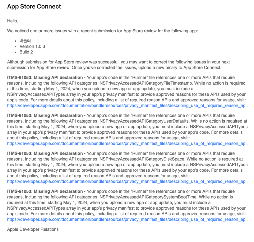 내용을 보아하니 2024년 5월 1일부터는 이메일 내용같이 새 앱이나 앱 업데이트를 업로드할때 앱의 개인정보 보호 매니페스트에 NSPrivacyAccessedAPITypes 배열에 위 내용이 사용되는 이유를 포함해야한다고한다.