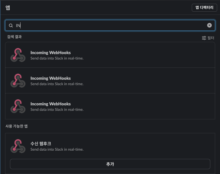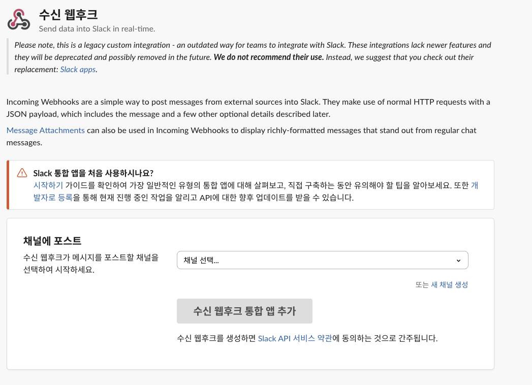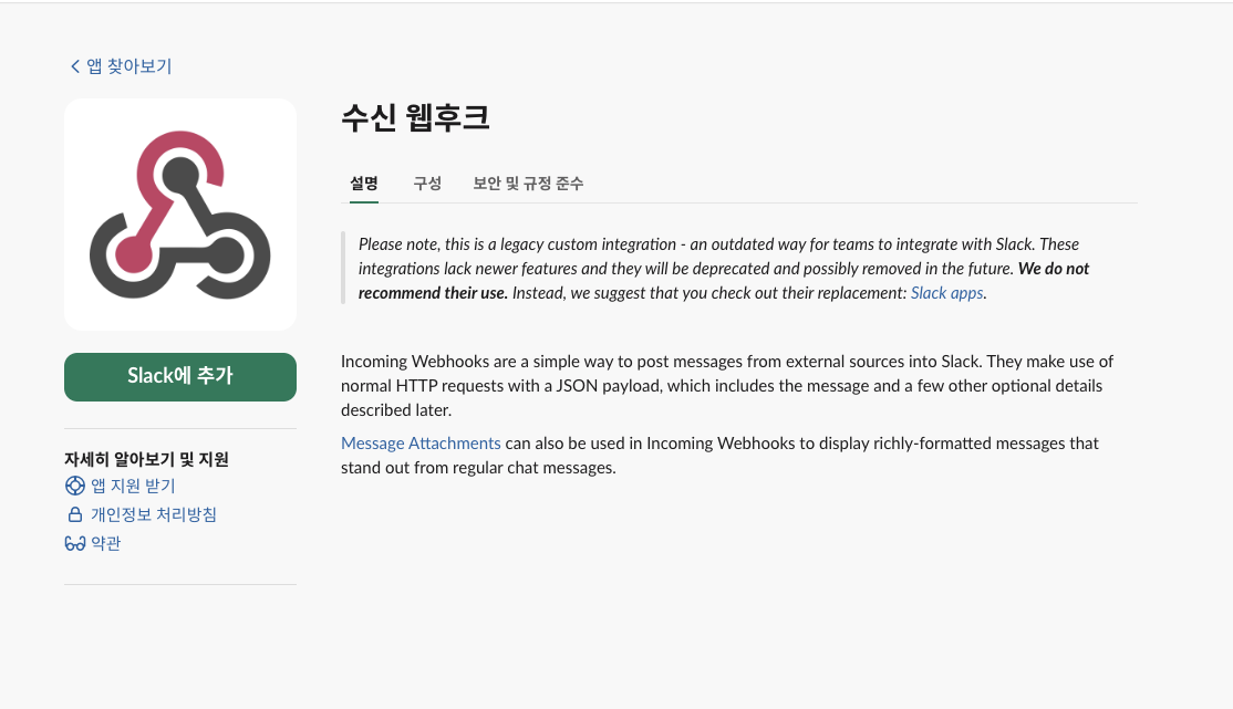 일단 Slack에서 수신 웹후크를 추가해준다.