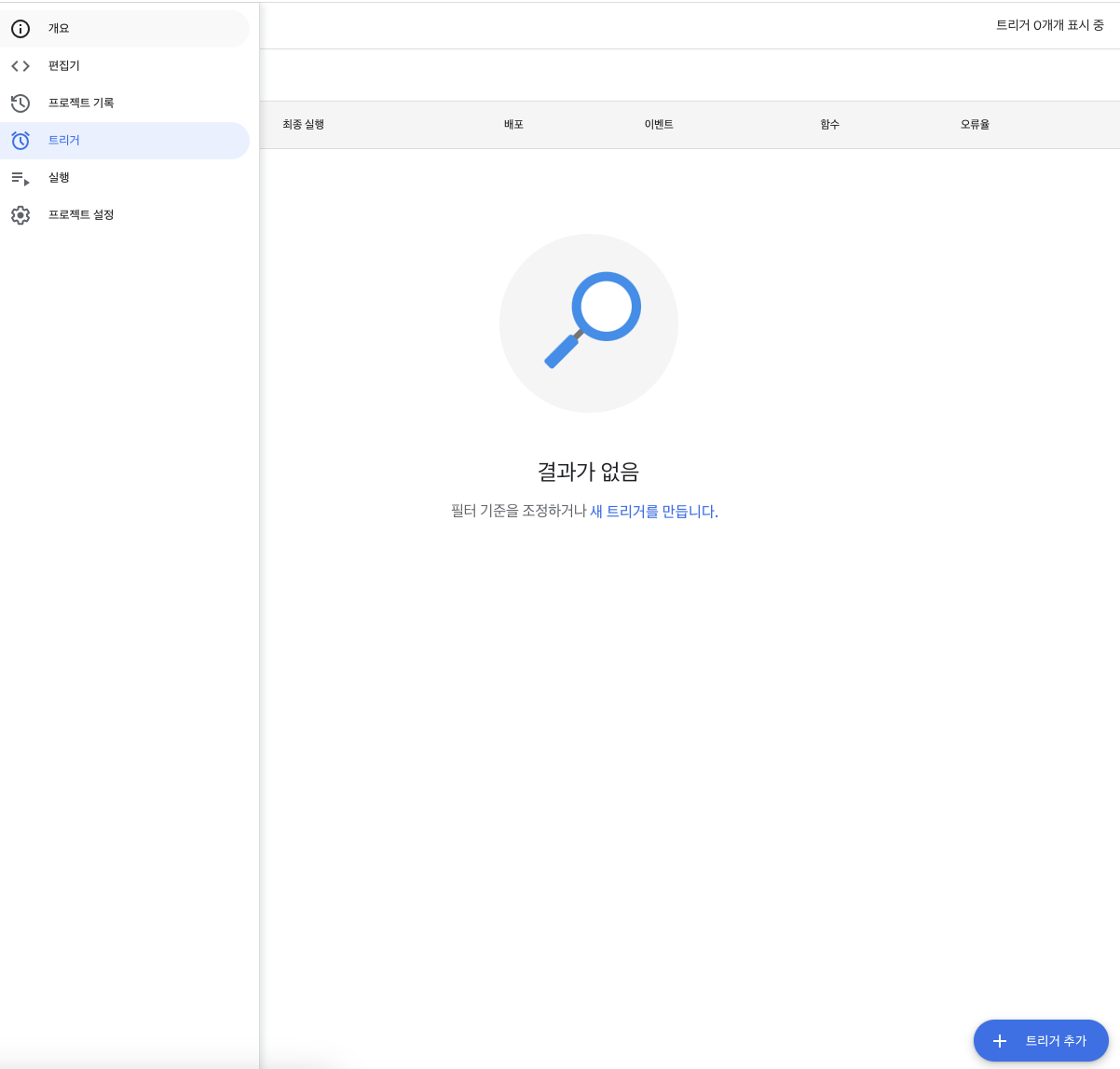 그럼 이렇게 이런 화면이 나오는데 파란색 + 트리거 추가 버튼을 클릭